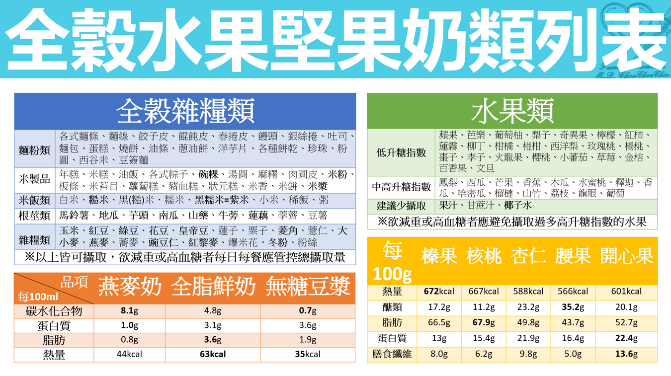 表列為減重最重要的醣類,包含全榖雜糧類及水果類。還有高熱量的堅果類以及民眾常稱呼的奶類,包含燕麥奶、鮮奶、豆漿等。詳細熱量、碳水化合物、蛋白脂、脂肪、膳食纖維可查閱『FDA食品藥物消費者專區整合查詢服務』。 養成好習慣瀏覽食品外包裝「營養標示」,確認食品含碳水化合物及熱量,輕鬆控糖並順利減重。