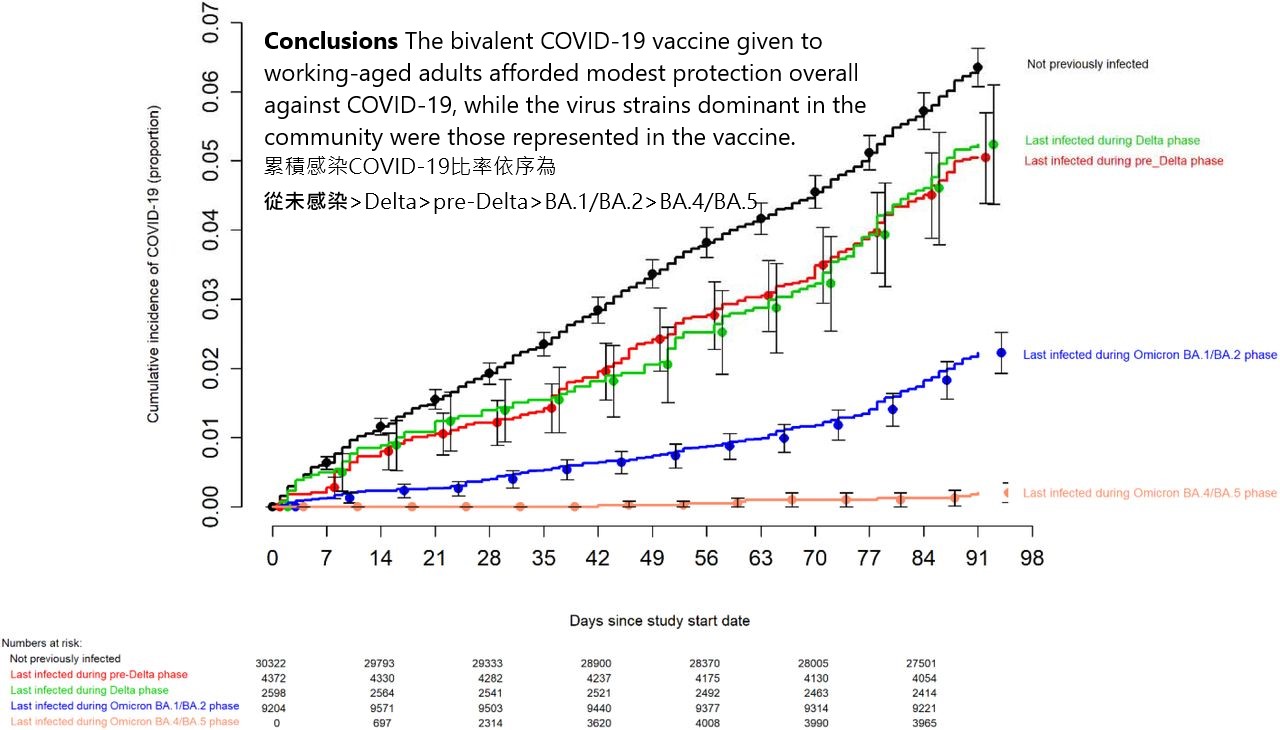- 變種病毒的免疫時效:感染的變種病毒株越接近當前流行的病毒(如 Omicron BA.4/BA.5),其保護力越強,累積感染率最低。
