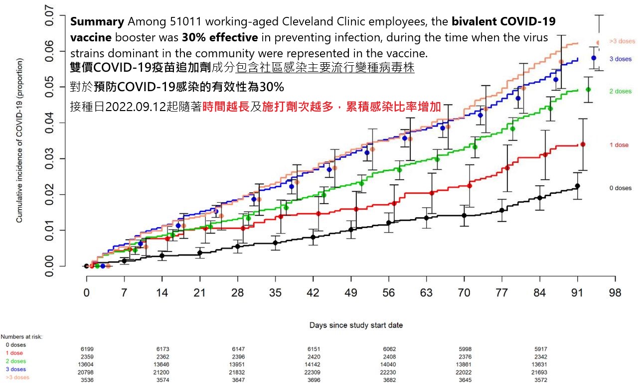 - 雙價疫苗有效性:在克里夫蘭醫學中心 51,011 名員工的研究中,雙價新冠疫苗追加劑預防感染的有效性僅為 30%。