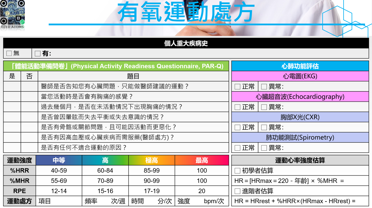 為運動前必須執行的篩檢工具PAR-Q 問卷旨在辨識出可能因運動而增加風險的因子,包含: