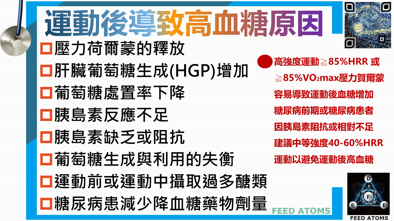 運動後高血糖的生理機轉主要涉及高強度運動(≧85%HRR≒85%VO2max 或≧85%1RM)引起的壓力荷爾蒙釋放,這些荷爾蒙刺激肝臟增加葡萄糖生成,且葡萄糖生成的速度超過了肌肉對葡萄糖的利用和處理速度,尤其是在胰島素反應不足或作用不佳的情況下,更容易造成高血糖狀態。血糖高低波動幅度大的危害比單純高血糖更危險,會加劇血管發炎、損害胰島細胞,增加大血管(心血管疾病、中風)及小血管(腎臟病、神經病變)併發症風險,並導致疲憊、情緒起伏、免疫力下降等問題,形成惡性循環。