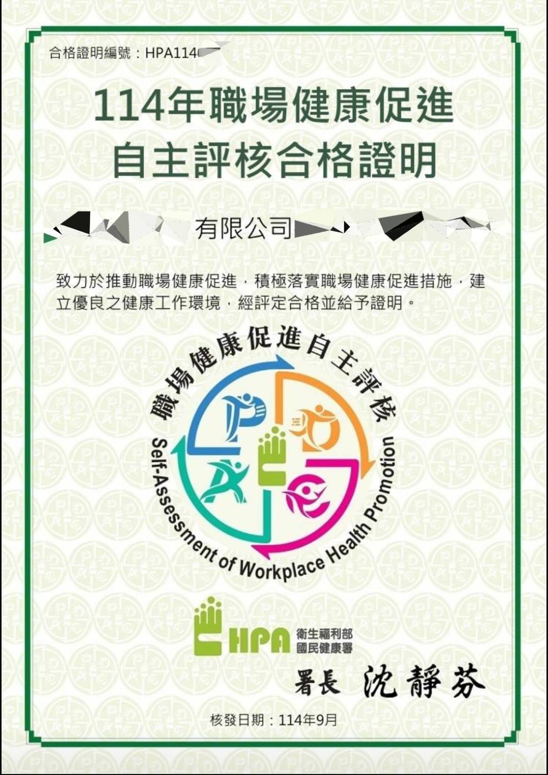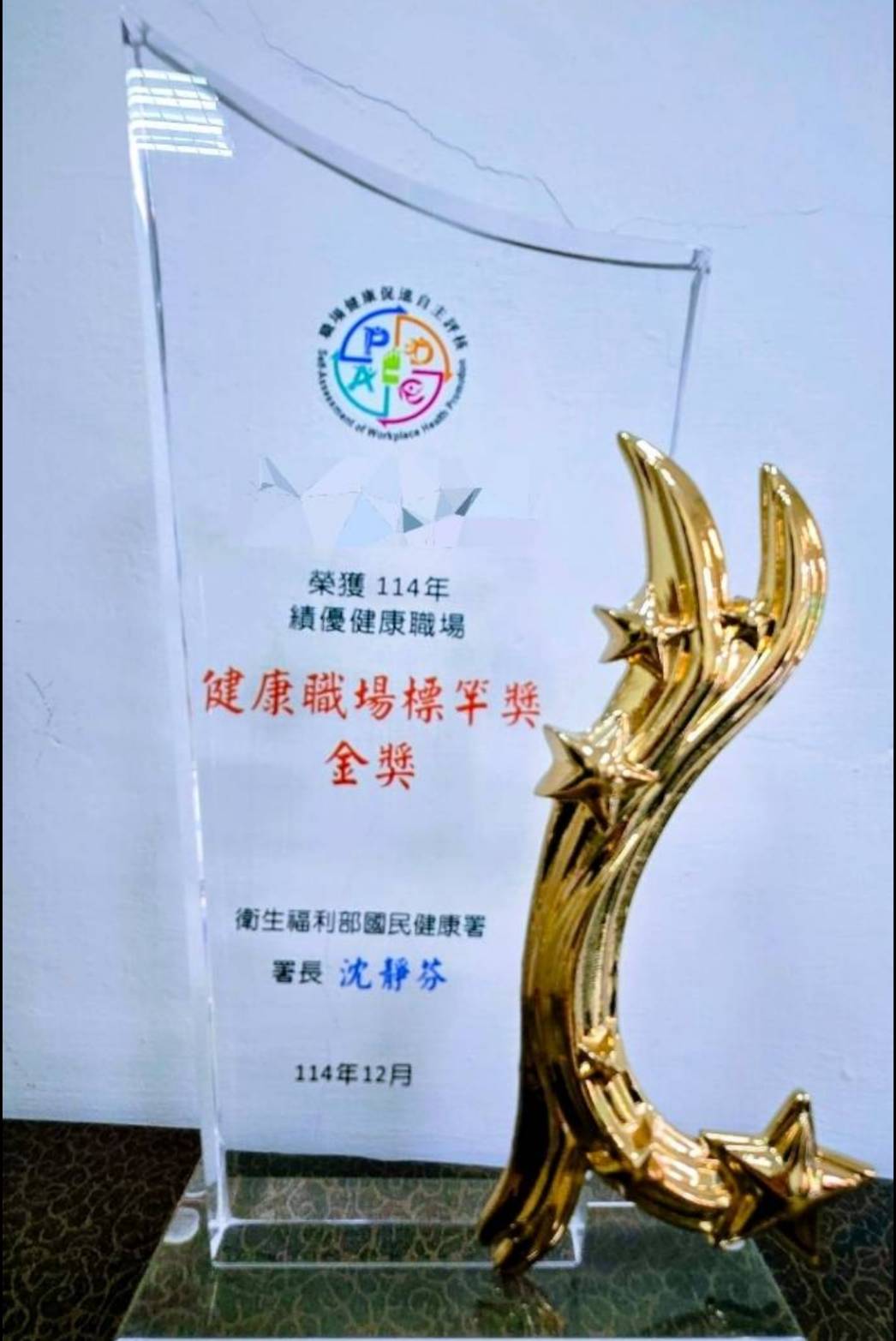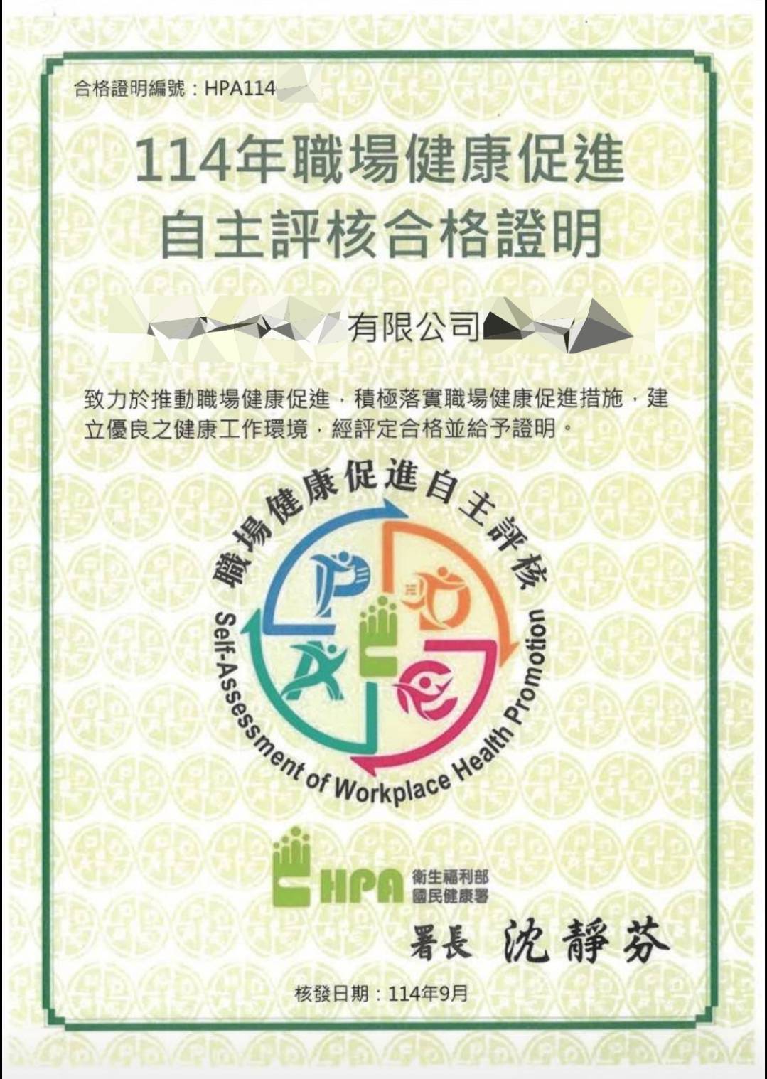 114年輔導廠家奪得績優健康職場標竿獎及健康促進自主評核並順利取得獎牌及合格證明書